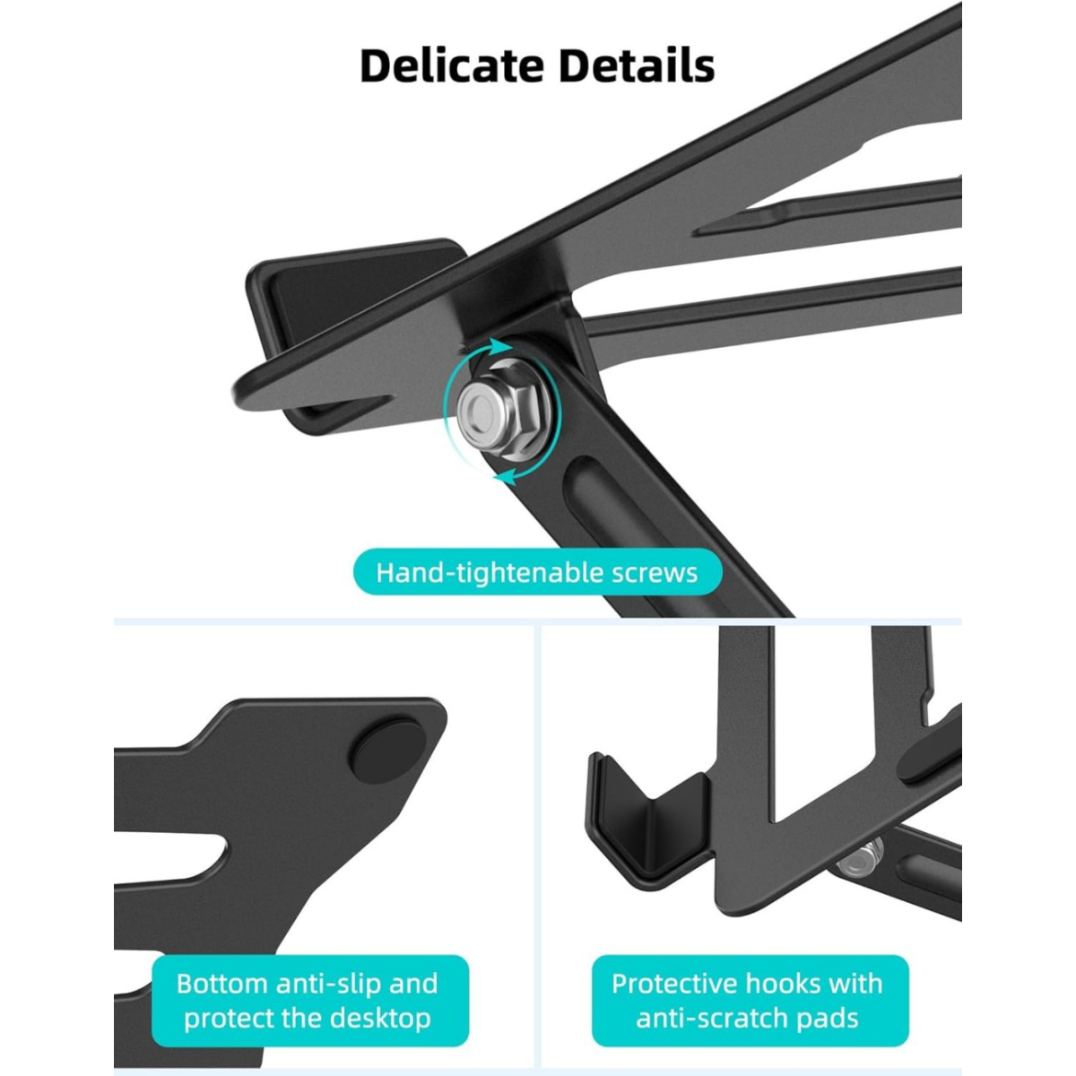 3. Stability and protection: The rotary laptop bracket is made of thickened metal with smooth edges, which can protect the computer from scratches. A highly durable silicone pad is provided to ensure a close connection with the desktop, and your laptop is firmly fixed in place without fear of shaking and slipping.